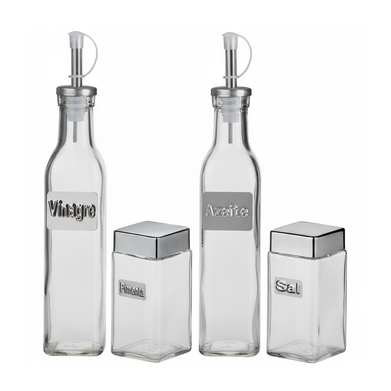 O cojunto de galheteiro label 4 Peças da Euro Home é ideal para armazenar e servir azeite, vinagre, sal e pimenta. Com Peças fabricadas em vidro e tampa e aço inox, o conjunto é higiênico e fácil de ser lavado. Possui ainda um exclusivo suporte em aço cromado.