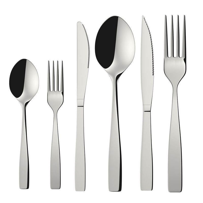 Elegância que atravessa o dia a dia e as ocasiões especiais. Produzido em aço inox e polido individualmente, serve até 6 pessoas com serviço completo para mesa e sobremesa. As facas com cabo oco e lâminas temperadas oferecem alta resistência à corrosão, fio duradouro e não riscam porcelanas. Vem com estojo para organizar e proteger.