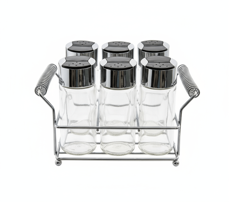 Conjunto com 6 Porta-condimentos ovais de vidro com tampa plástica dosadora. Acompanha suporte em aço cromado que acondiciona e facilita o manuseio do produto.