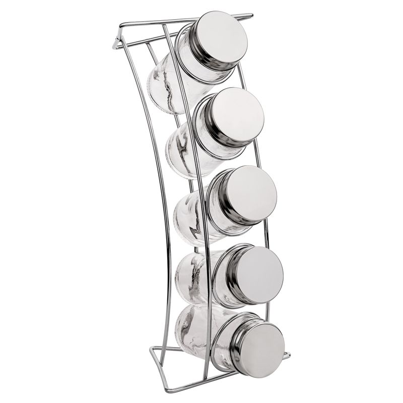 Conjunto com 5 Porta-condimentos redondos de vidro com tampa em inox. Acompanha suporte em aço cromado que acondiciona e facilita o manuseio do produto.